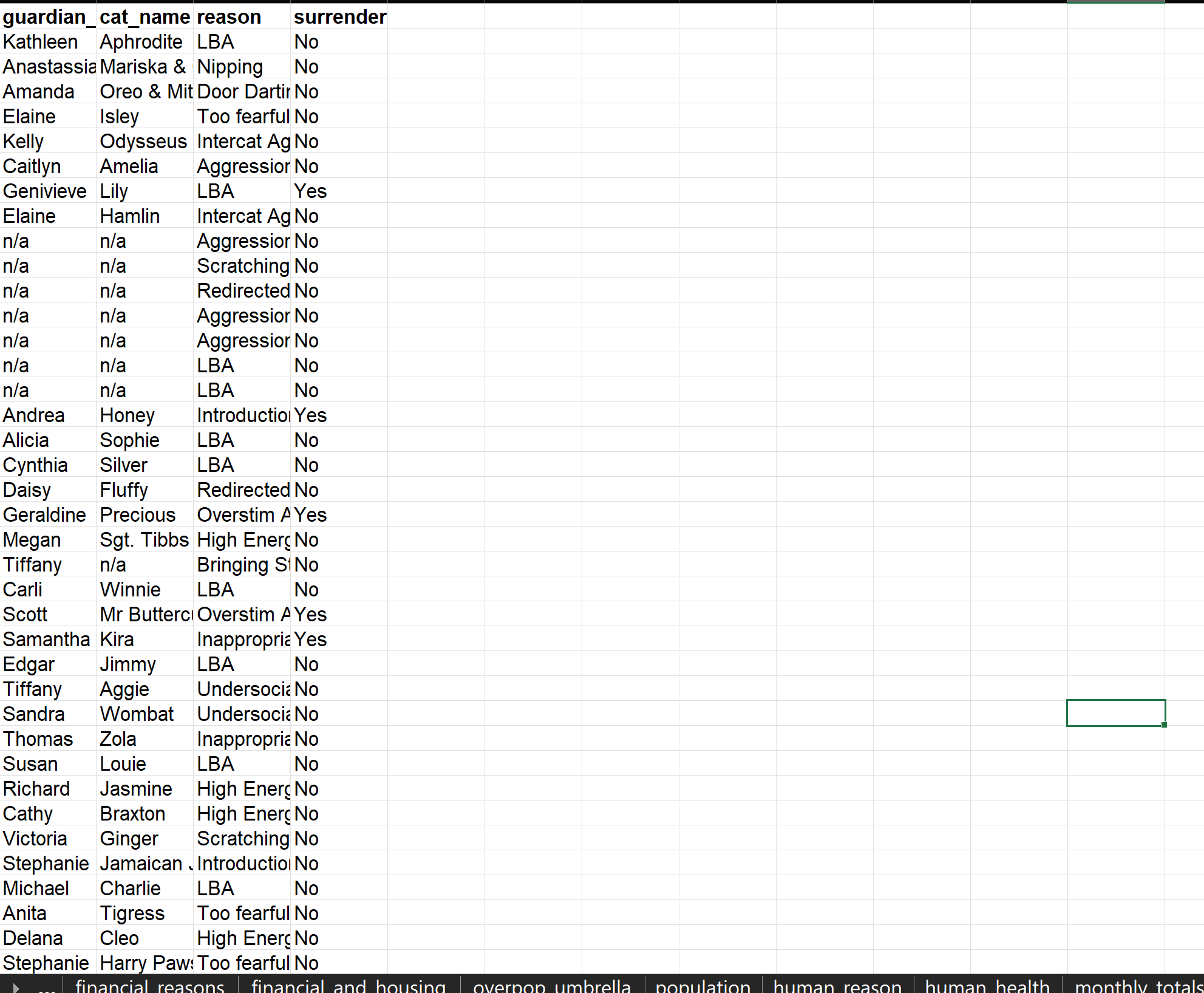 (This page is primarily for showing my process, however, for confidentiality purposes screenshots of my primary spreadsheet containing shelter-sourced data cannot be posted here. If requested for professional purposes, an altered version with confidential information removed that is agreed upon by the data source can be provided)