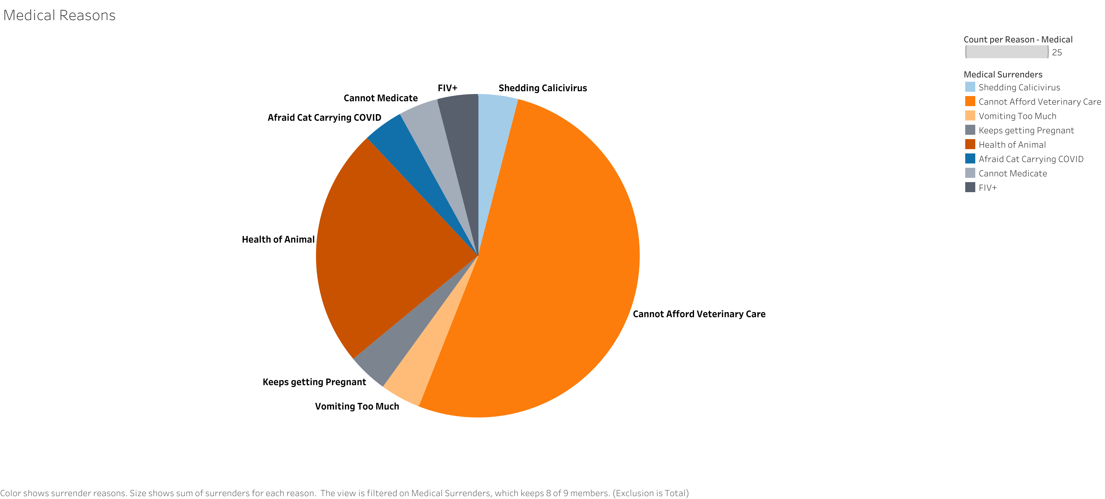 I did not create a viz for this, but, a unique thing about 2021 is that we had enough issues with a new group of surrenders to develop a new "Umbrella" - mental health/law associated surrenders. This includes animal abandonment (more often than not, the associated investigation/notes corroborated mental health and/or legal issues being the cause), animal cruelty, domestic violence and fear for animal's safety due to other individuals, incarceration, reporting of mental health by the guardian, and animal neglect.